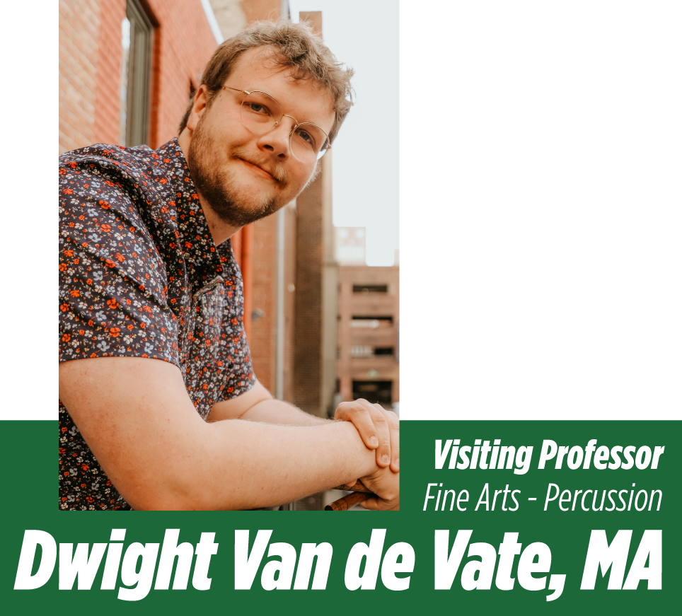 Hailed as “handsome” by his mother, Dwight Van de Vate is a percussionist with a reputation for his engaging personality that translates to his performance. Some of the quotes from his concert attendees include, “That was good,” and, “You must be tired,” which are also quotes from his mother. This can be seen through his performances in the Memphis area including recitals and shows. Other highlighted performances include The New Literature Showcase and the IPEC Showcases at the Percussive Arts Society International Convention with his Alma mater, The University of Tennessee at Knoxville. During the IPEC Showcase, Dwight had the opportunity to play the world premiere of “Honeybee, 1812” by Evan Chapman. Some of his other performances include “A Wave and Waves” by Michael Pisaro at Knoxville’s Big Ears Festival.